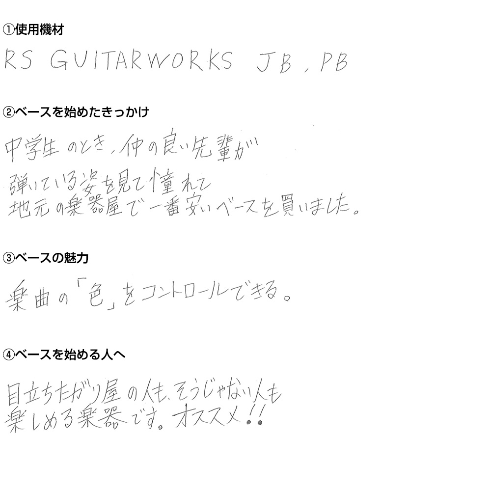 多くのクアイフサウンドの作詞・作曲を手掛ける。型にとらわれない多彩な楽曲を送りだすクアイフのメロディー・メーカーでありリーダー。非常にストイックな性格で、楽曲制作中は二日徹夜し一日寝るという生活サイクルになる。ベースの他にギターやピアノもこなす。名古屋グランパスエイトユースに在籍していた経歴を持つサッカー少年で、サッカー日本代表の吉田麻也選手をはじめ当時のチームメイトとは今でも交友を持つ。座右の銘は「努力なくして栄光なし」。